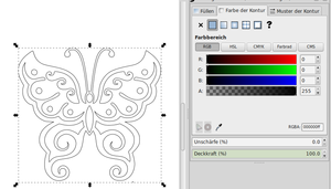 Für die Lasertags brauchen wir zukünftig verschieden farbige Pfade und Objekte. Da der Lasersaur letztlich nur mit Konturen und Pfaden arbeitet, nützt euch eine ausgefüllte Fläche nichts. Ihr könnt Objekte und Pfade wie folgt einfärben; selektiert ein Objekt, klickt mit der rechten Maustaste drauf und wählt „Objekteigenschaften“ nun sollte am rechten Bildschirmrand ein Fenster aufgehen mit den Tabs „Füllen“, „Farbe der Kontur“ und „Muster der Kontur“. Aktiviert bei Füllen das „X“, so ist das Objekt leer und wählt bei „Farbe der Kontur“ eine der Farben für die Schnitt-Reihenfolge (dazu kommen wir gleich).